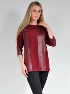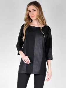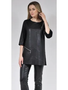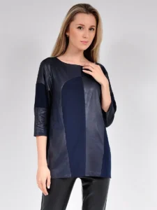 Туника женская большого размера удлиненная с отделкой из ткани под кожу, с длинным рукавом и рукавом три четверти. Туника -хит сезона. Модная туника, вечерняя, нарядная, повседневная ,свободного кроя будет удачным вариантом для офиса, школы, работы, отдыха, прогулок. Модная туника в стиле оверсайз подойдет для праздника, хороша будет и на каждый день, и для учебы в вузе. Великолепно подойдет беременным. Вырез горловины — округлый, рукав 3/4. Необычные линии реза спереди и сочетание модных цветов создадут Вам неповторимый образ вместе с широкими, зауженными, прямыми, удлиненными и укороченными брюками или прямой юбкой. Выпускается в цветах : черный, синий, бордо, сиреневый, фиолетовый. Туника великолепно стирается в стиральной машине при деликатном режиме, хорошо гладится с изнанки. Идеально сидит и стройнит.